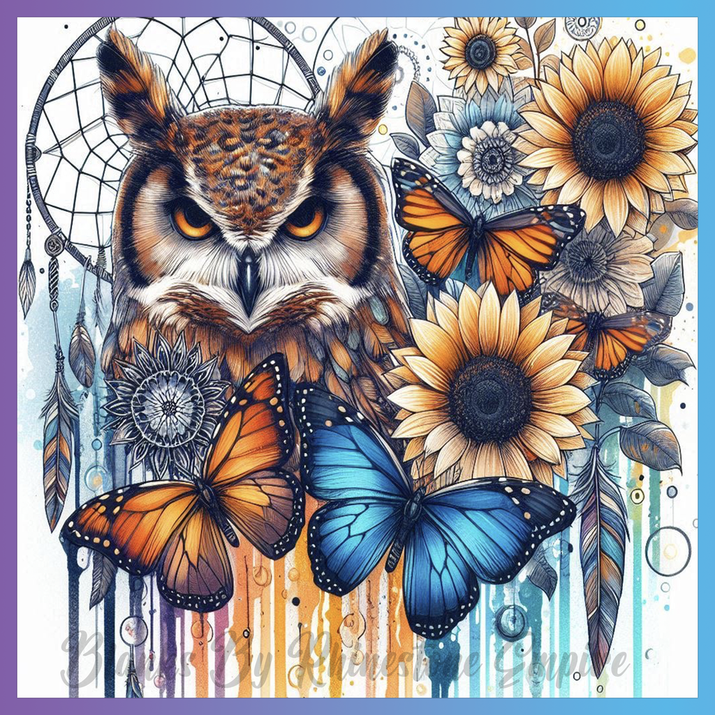 Theme: Owl with butterflies, sunflowers, dreamcatcher, colorful.